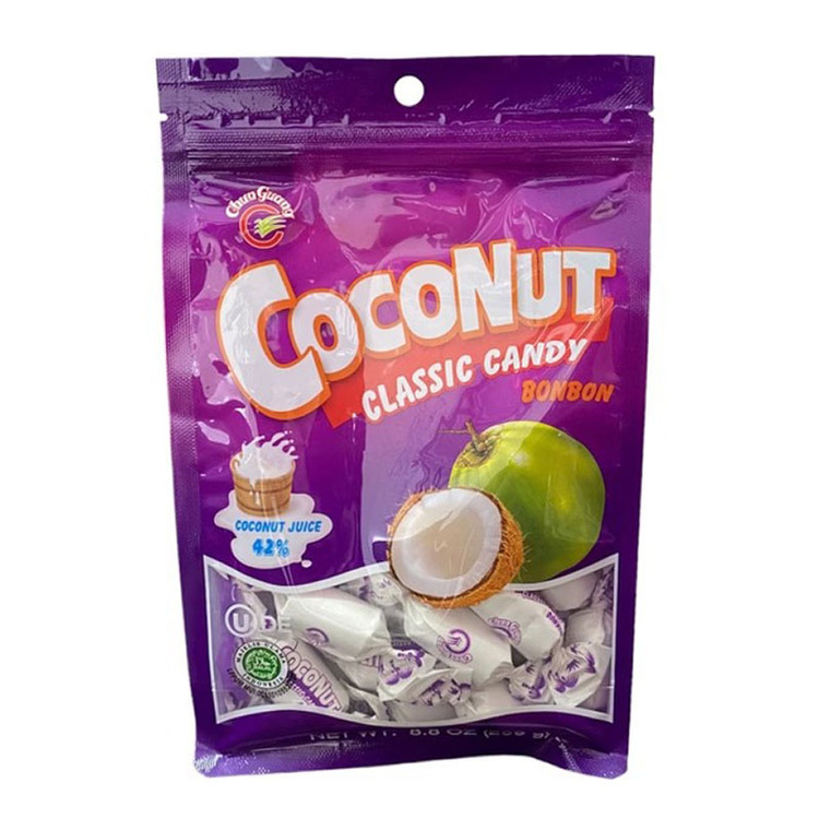 این آبنبات با آب نارگیل واقعی تهیه شده و دارای طعمی شیرین و بافت کمی جویدنی است.