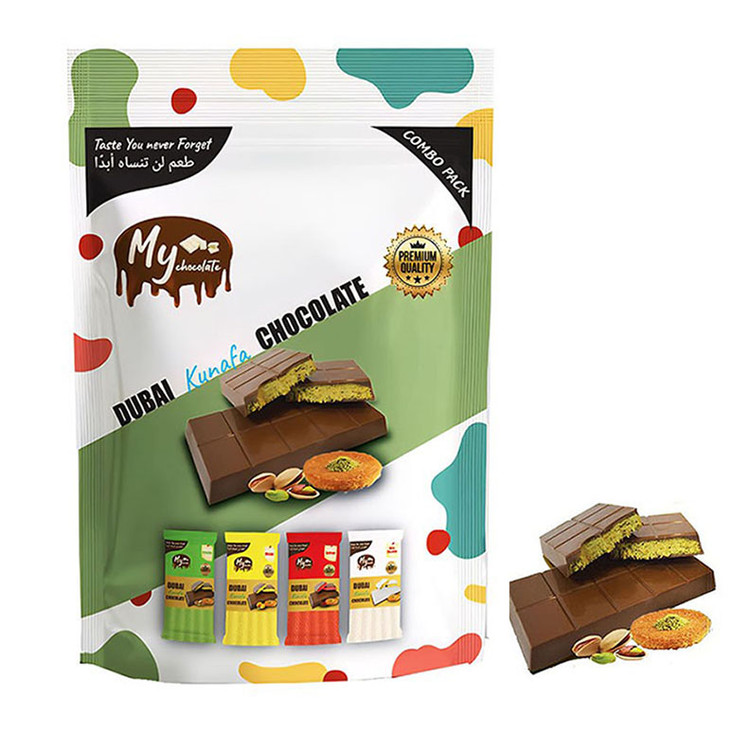 یک شکلات لوکس که از ترکیب یک لایه شکلات شیری با خمیر پسته و رشته های ترد کنافه ( خمیر فیلو ) پر شده است.
