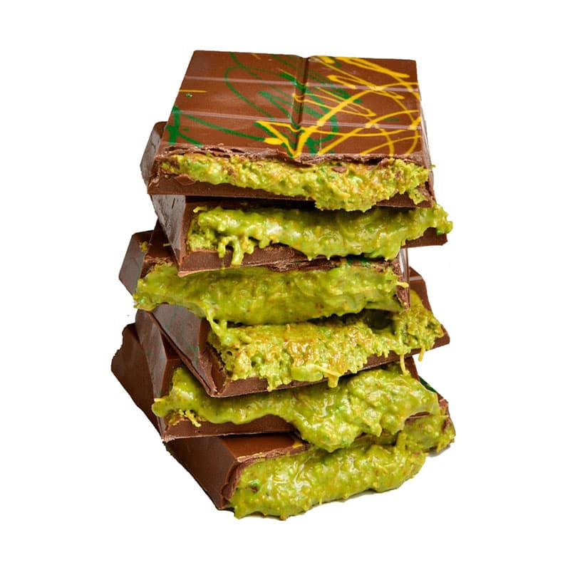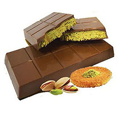 یک شکلات لوکس که از ترکیب یک لایه شکلات شیری با خمیر پسته و رشته های ترد کنافه ( خمیر فیلو ) پر شده است.