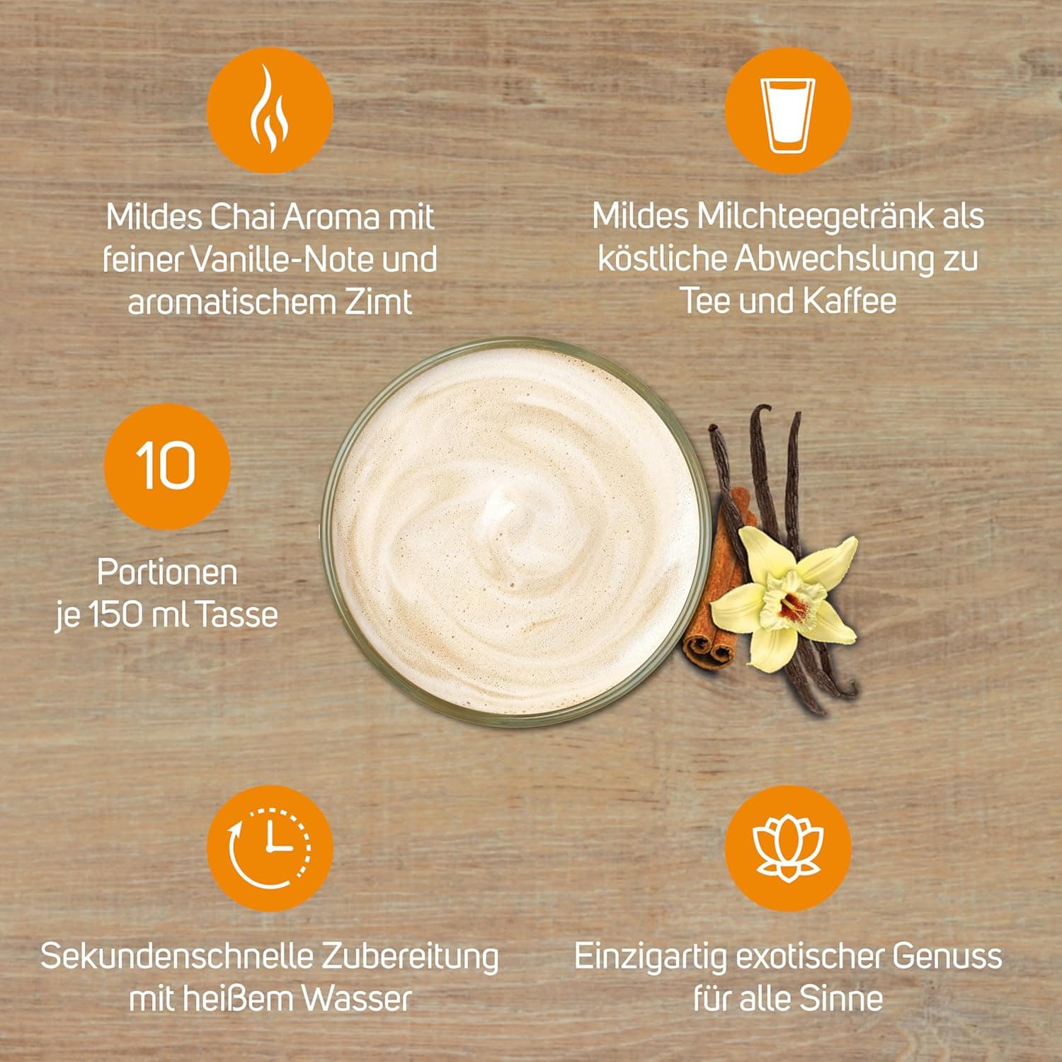 این محصول یک نوشیدنی چای شیری ملایم با عصار چای سیاه و طعم دهنده وانبل و دارچین است.